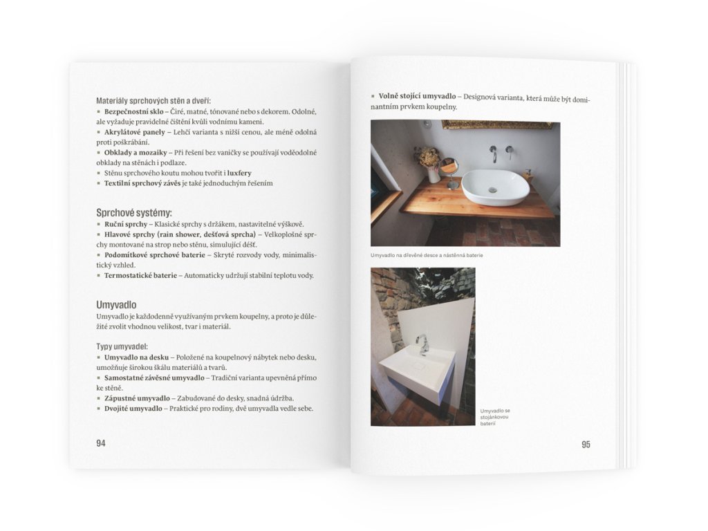 - Systematicky řazené kapitoly od obecných tipů vč. instalací, přes materiálová řešení, po finální úpravy a dekorace.
